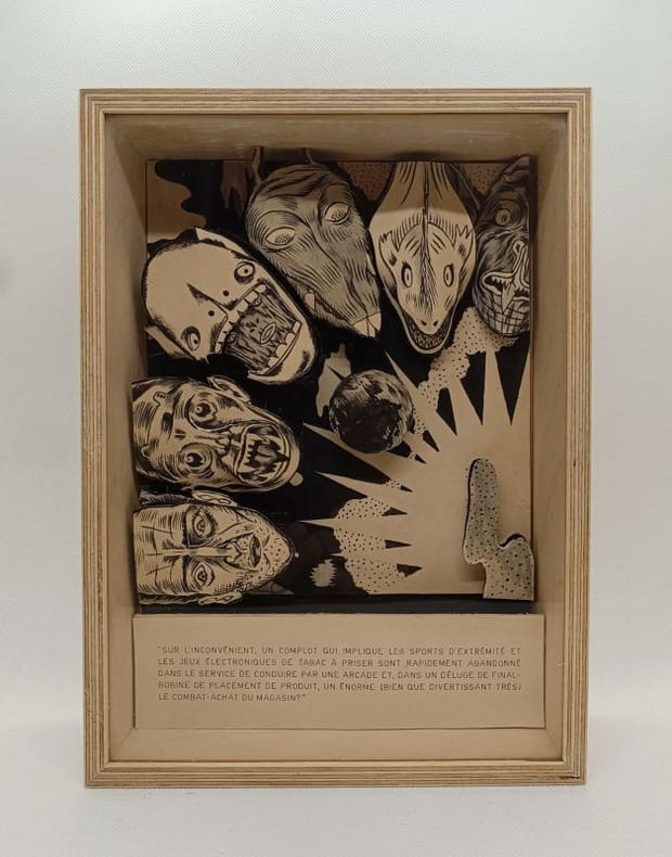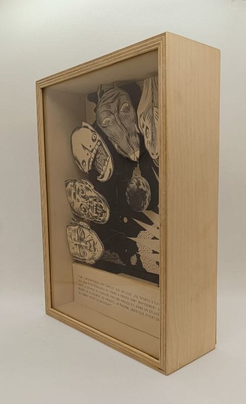 Diorama, encre sur papier et bois. 2023. Dim: 270 x 190 x 70 mm. Signé au dos par l'artiste.